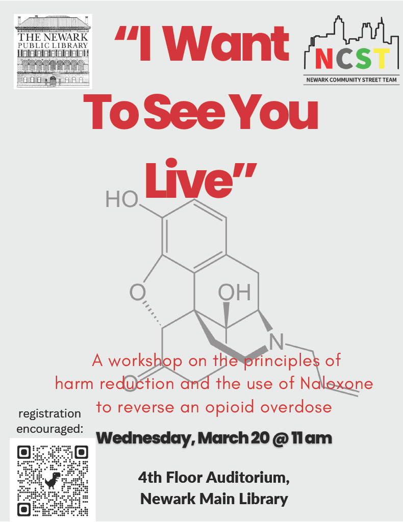 All over the city of Newark there are overdoses–fatal and non-fatal–on a daily basis. The Newark Community Street Team – Overdose Response Team (NCST-ORT) is out in the field and knows what’s going on. The key to preventing overdoses and deaths, the key to “seeing people live” is Narcan/Naloxone education and training. The importance of both having access to Narcan and knowing what to do in response to an Overdose is crucial. Participants will learn about the importance of naloxone in preventing overdose deaths and how to administer it in an emergency.
