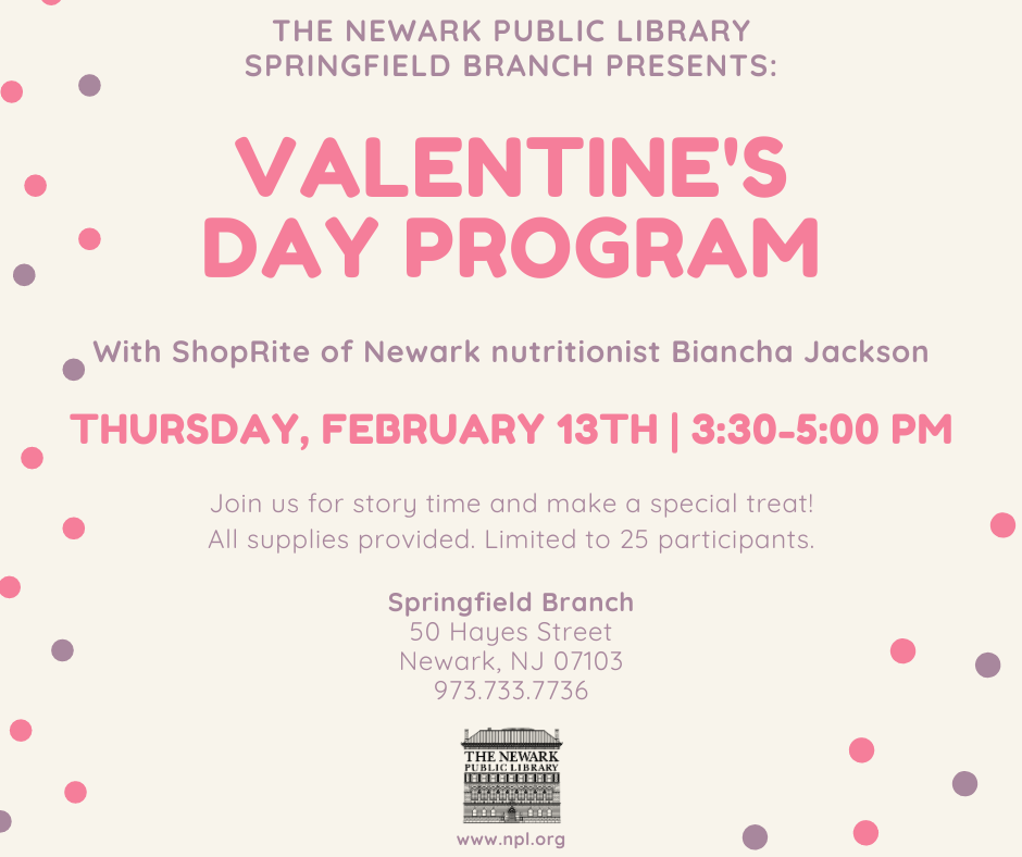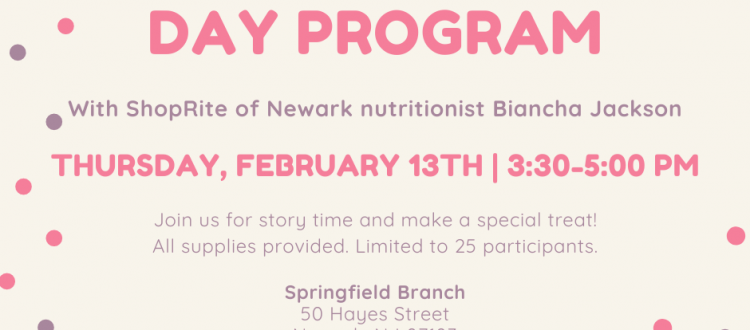 Join us at the Newark Public Library’s Springfield Branch for a Valentine’s Day program with ShopRite of Newark nutritionist Biancha Jackson. This program will include a story time and making a special treat.